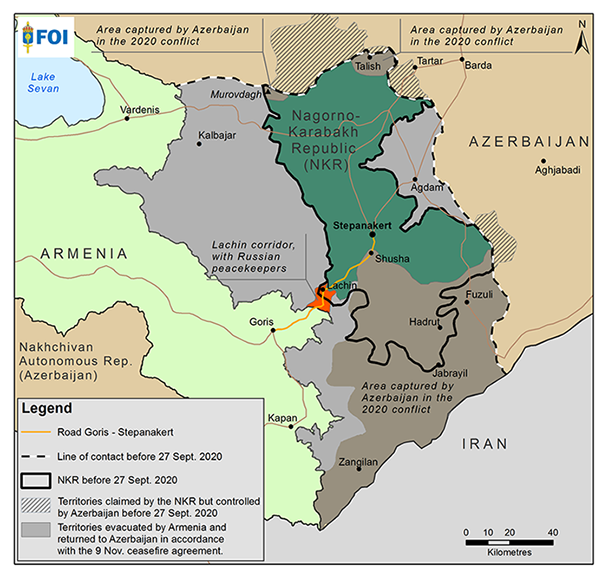 Före Azerbajdzjans offensiv hösten 2023 kontrollerade armenierna Nagorno-Karabach (det mörkgröna området på kartan ovan). Kartan visar också vilka områden som Armenien respektive Azerbajdzjan kontrollerade före och efter kriget 2020. Källa: Totalförsvarets forskningsinstitut, FOI