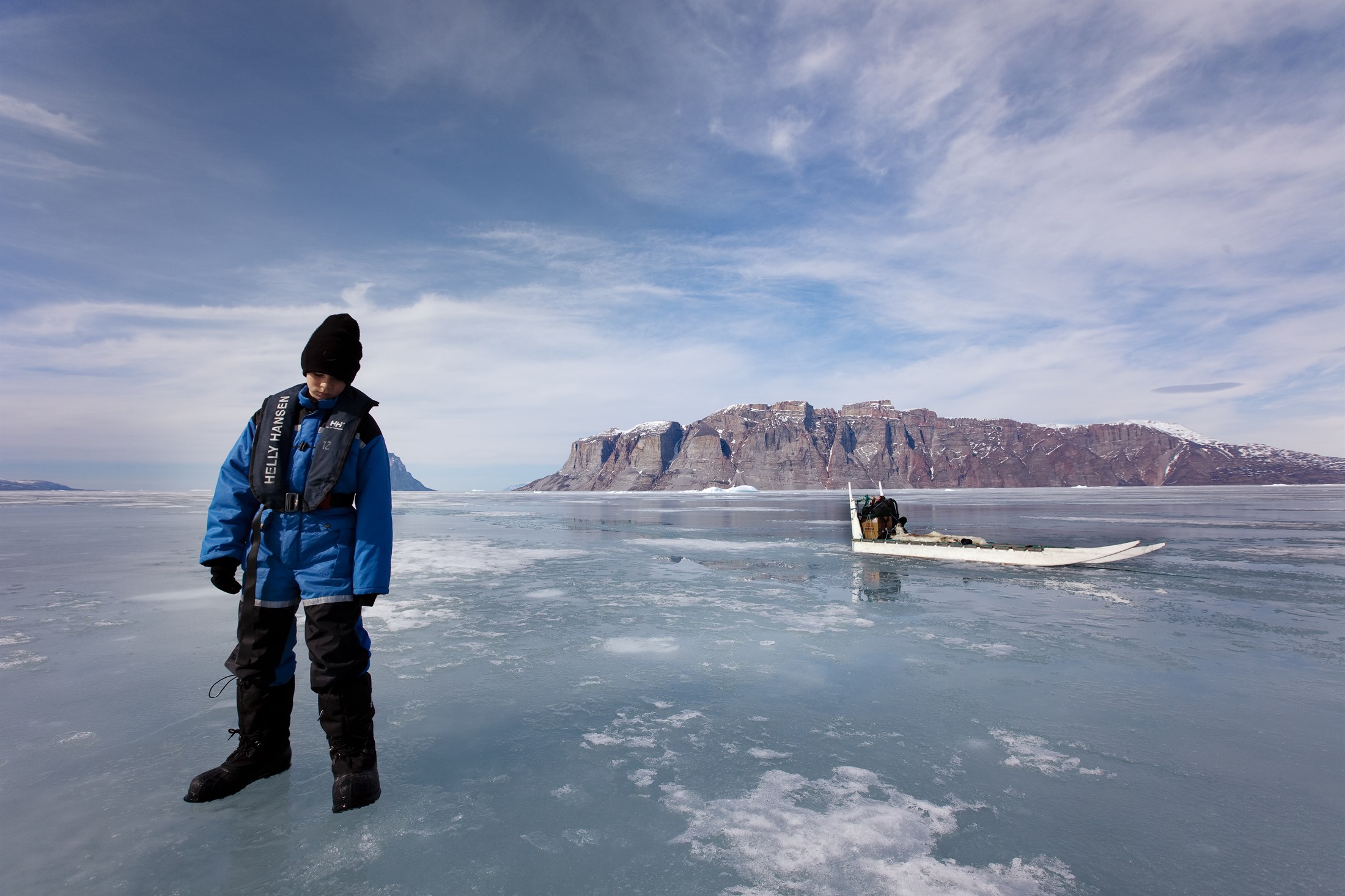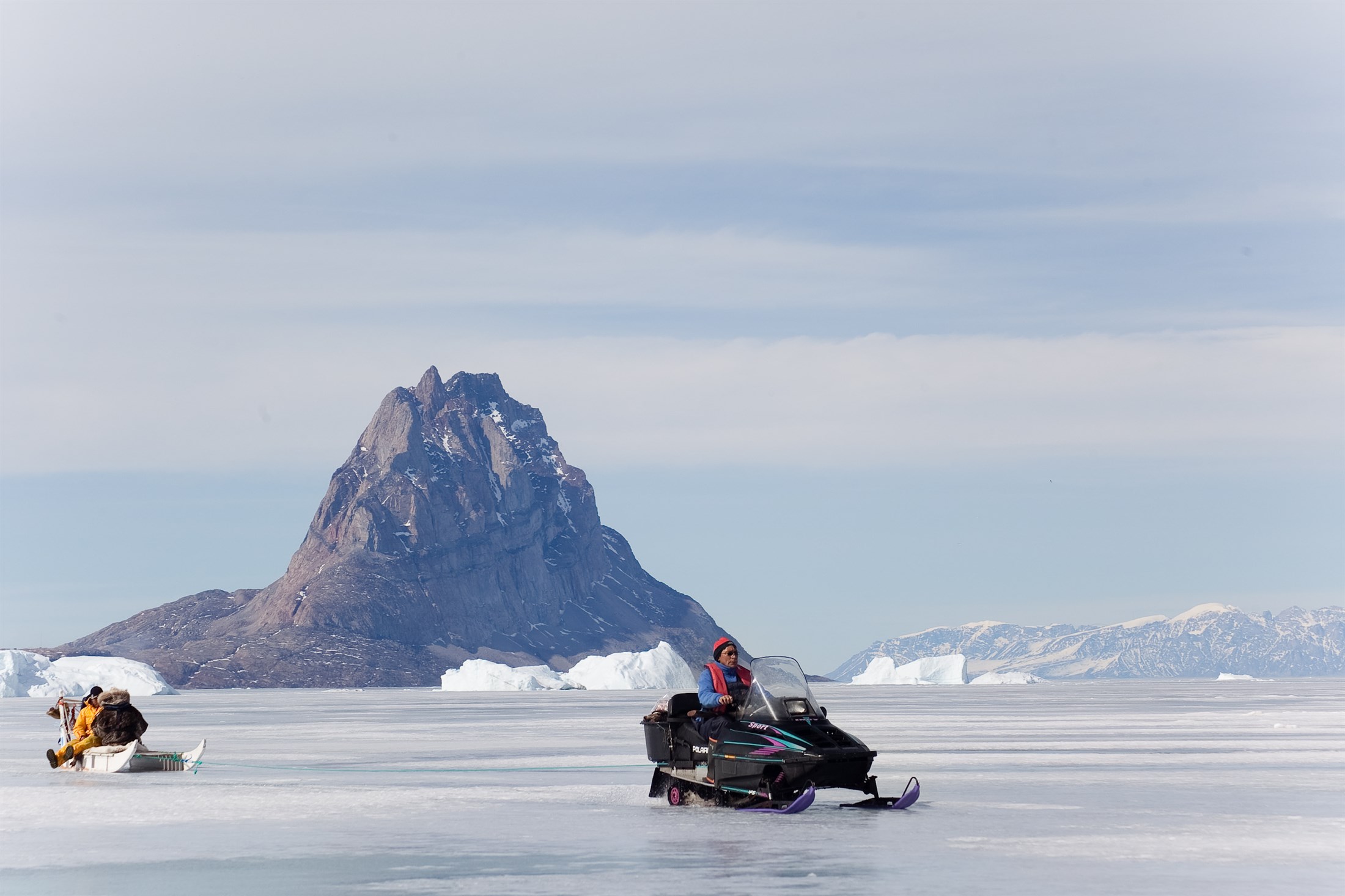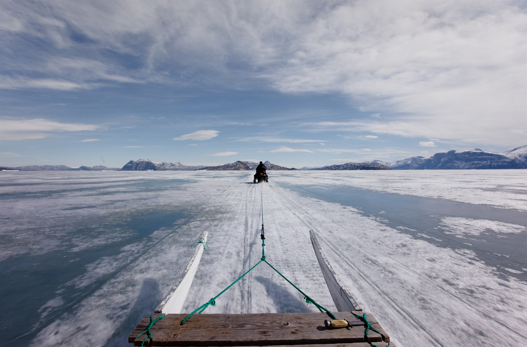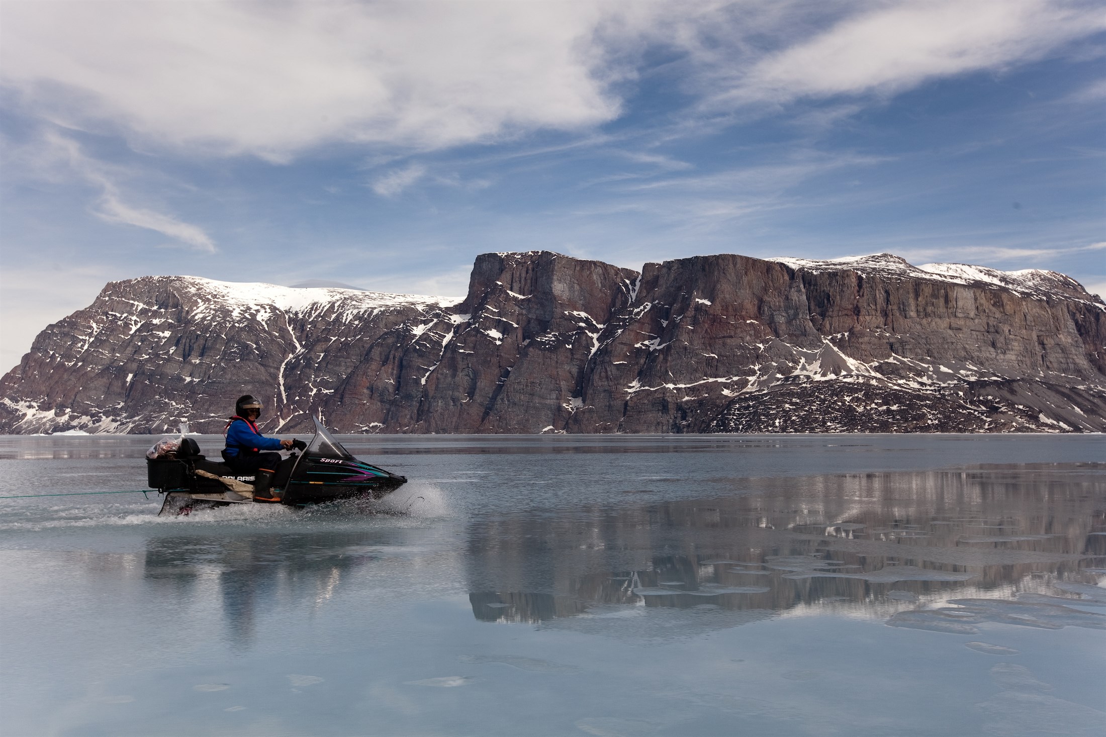 Med snöscooter över smältande isar på vid Grönlandskusten. Video: Lawrence Hislop, Grid Arendal Photo Library