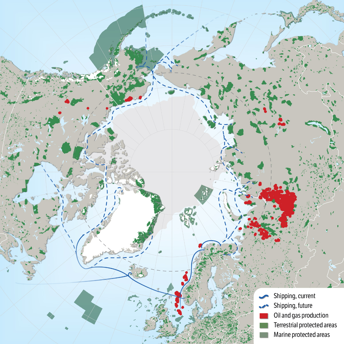 Men den minskade ismängden blottlägger även nya platser för exploatering av olja och mineraler och öppnar Nordostpassagen för sjöfart genom regionen. Det gör regionen högintressant för nya aktörer, vid sidan om dem som redan verkar här.