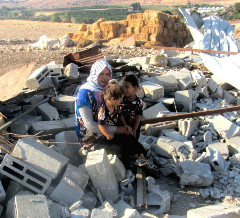 I den Israelkontrollerade delen av Västbanken är det närmast omöjligt för palestinier att få bygglov. Istället rivs palestinska byggnader, som här i Jordandalen, där Khadijeh Bsharat sitter med sina döttrar på ruinerna av familjens hem vilket revs av israeliska myndigheter i augusti 2015. Foto: Aref Daraghmeh, B'Tselem.