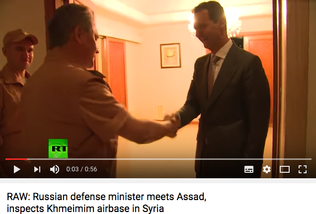På TV-bilder som visats på Russia Today gör Bashar al-Assad ett besök på Khmeimim, en rysk flygbas vid Syriens kust. TV-bilderna avslöjar att Assad inte var beredd på att han på en bas i sitt eget land skulle få träffa Rysslands försvarsminister. Dessa bilder förstärker de oppositionellas uppfattning att Assad är en vasall åt Vladimir Putin – samtidigt som de noterar att det finns ett konkurrensförhållande mellan Moskva och Teheran, Assadregimens båda allierade.