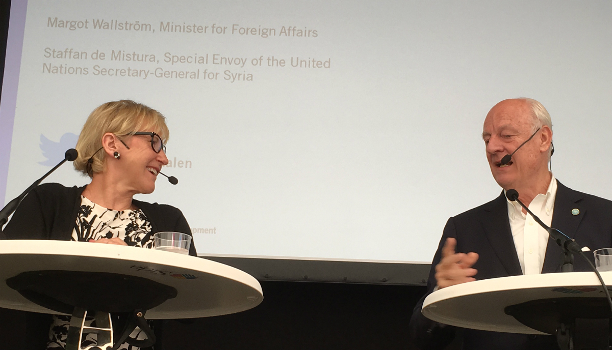 Utrikesminister Margot Wallström och FN-sändebudet Staffan de Mistura på ett seminarium i Almedalen som arrangerades av Folke Bernadotteakademin. Foto: Bitte Hammargren