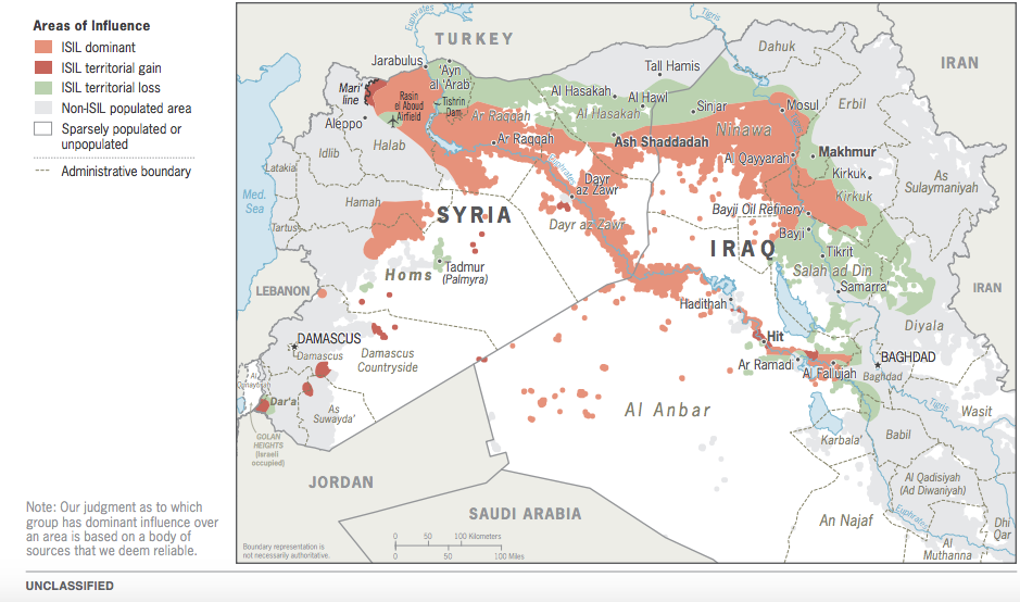 På senare tid har IS förlorat territorium i både Syrien och Irak. Kartan  avspeglar maktförhållandena fram till april 2016 . IS-kontrollerade områden i mörkröd färg. Karta: Iraks försvarsdepartement