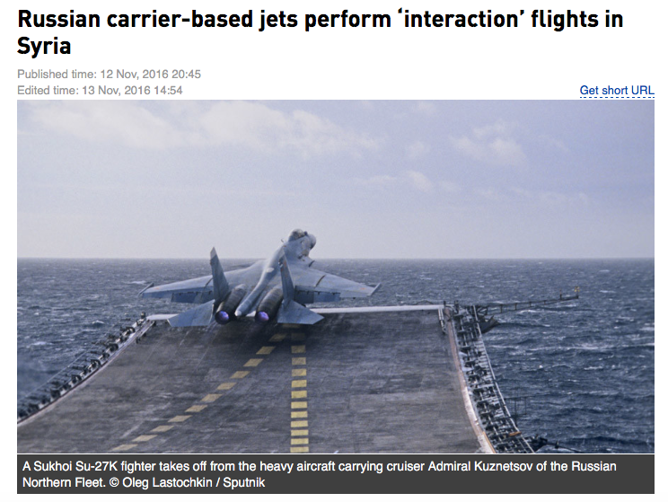 Hangarfartyget Admiral Kuznetsov med stridsflyg som nu sätts in i Syrien. Från Russia Today.