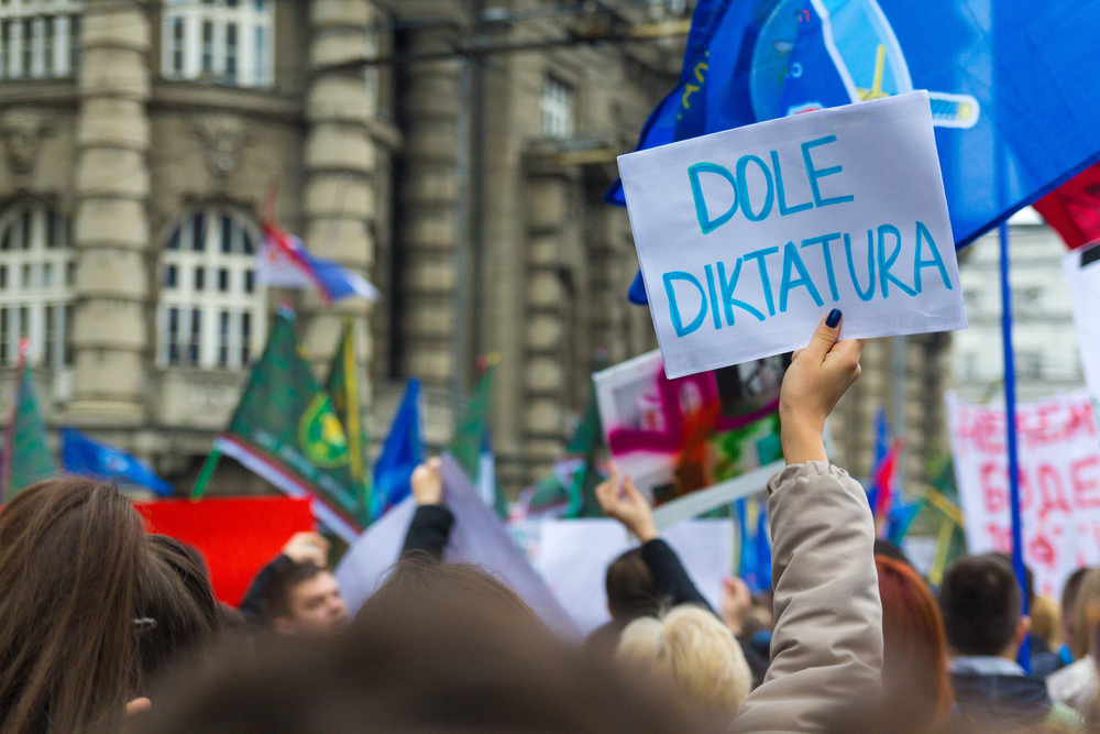 "Ned med diktaturen".  Protestplakatet är ett exempel på att det blivit vanligare med latinska bokstäver istället för kyrilliska i Serbien. Foto: Giovanni Vale/Shutterstock