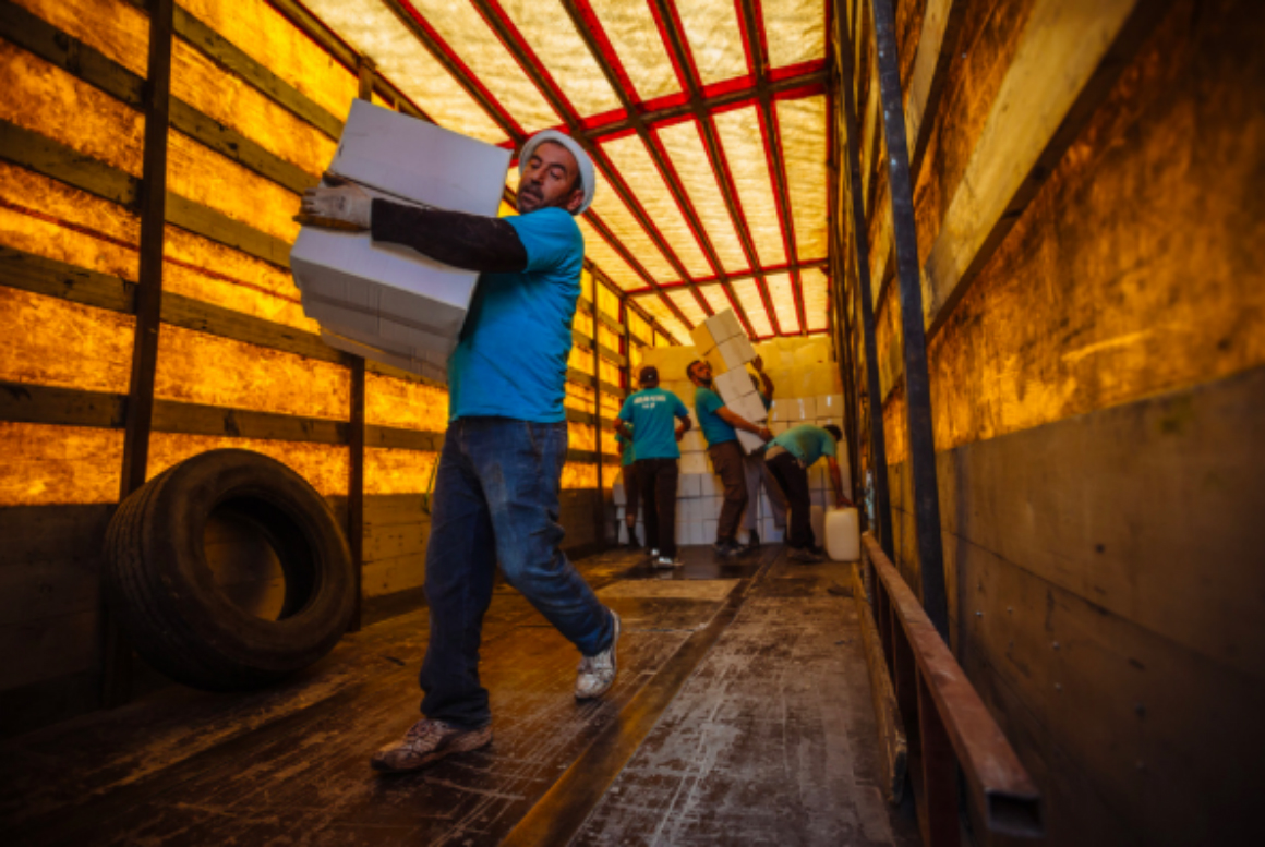 Syriska arbetare lastar ombord förnödenheter som ska köras in i Syrien från den turkiska gränsstaden Reyhanli. Foto: IOM/Muse Mohammed