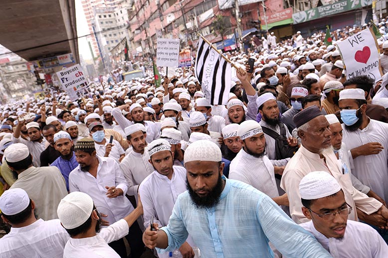 Bangladesh har varit relativt förskonat från islamistisk terrorism, men den militanta islamismen riskerar att bli ett farligt problem. I början av November samlade protester mot Frankrike stora skaror med protesterande män i Dhaka. Foto: Mahmud Hossain Opu/AP/TT