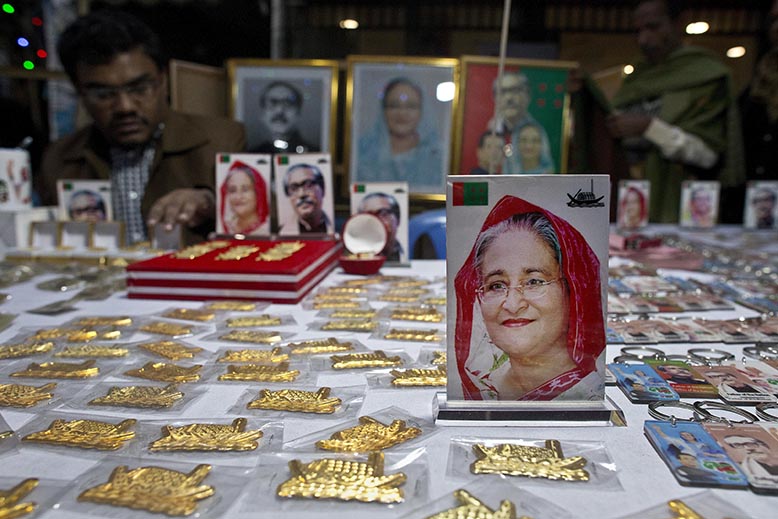 Bangladeshs premiärminister Sheikh Hasina kan glädjas åt landets ekonomiska framsteg och sina egna valframgångar. Här säljs kampanjmaterial I huvudstaden Dhaka inför parlamentsvalet 2018. Foto: Anupam Nath/AP/TT
