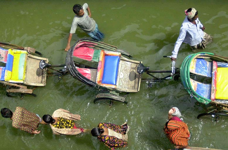 Så här är vi vana att se Bangladesh, översvämmat och traditionellt. Och den bilden är också sann. Men den genomsnittliga förväntade livslängden är nu längre än grannländernas. Foto: Pavel Rahman/AP/TT
