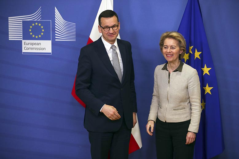 Glada miner utåt när premiärminister Mateusz Morawiecki möter EU-kommissionens ordförande Ursula von der Leyen i Bryssel, fastän polacken har jämfört unionens kommissionärer med politbyrån i Moskva under kommunisttiden. Foto: Francisco Seco/AP/TT