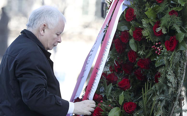 Polens de facto-ledare Jarosław Kaczyński lägger ner en krans till minne av sin tvillingbror, presidenten Lech Kaczyński, och de 95 andra som dog i en flygkrasch 2010. Jarosław Kaczyński har anklagat sina politiska motståndare för broderns död. Foto: Czarek Sokolowski/AP/TT