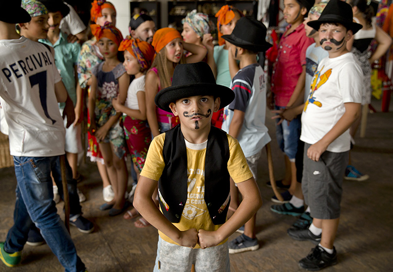 Romska barn deltar i en pjäs mot diskriminering i Bukarest i Rumänien. Foto: Vadim Ghirda/TT/AP
