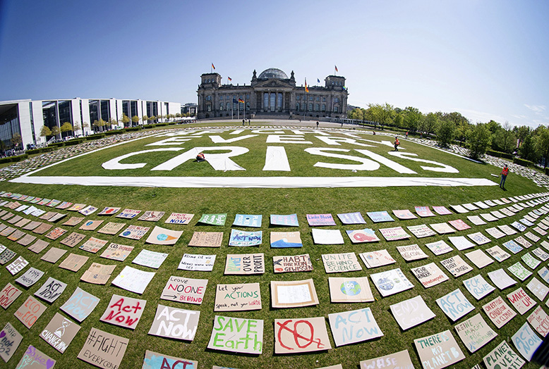Pandemin gör att klimatprotester under våren har tagit nya former. Rörelsen Fridays for Future strejkar digitalt och placerade i april ut affischer utanför riksdagshuset i Berlin. Foto: Kay Nietfeld/AP/TT