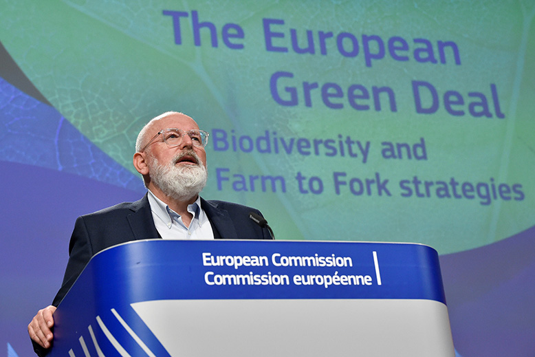EU:s klimatkommissionär Frans Timmermans i en presentation av EU:s ”gröna giv” vid en presskonferens i Bryssel i maj 2020. Foto: John Tys/AP/TT