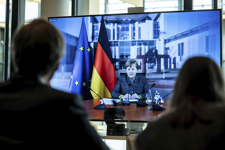 Förbundskansler Angela Merkel talar vid Petersbergdialogen, ett klimatforum som genomfördes digitalt i slutet av april 2020. Foto: Michael Kappeler/AP/TT