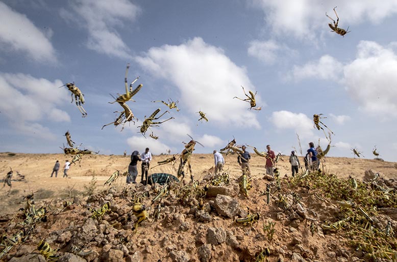 Under 2020 har flera länder i Östafrika lidit av en massiv invasion av vandringsgräshoppor som har potentialen att förgöra miljontals liv. Enligt FN:s livsmedels- och jordbruksorganisation FAO är det Kenyas värsta invasion på 70 år. Somalia som också är drabbat kan inte bekämpa invasionen med bekämpningsmedel eftersom det råder undantagstillstånd på grund av säkerhetsläget. När skördarna förstörs uppstår flyktingströmmar och länder som Uganda och Kenya, vilka redan hyser bland världens största flyktingbefolkningar, riskerar att bli ännu mer överbelastade.