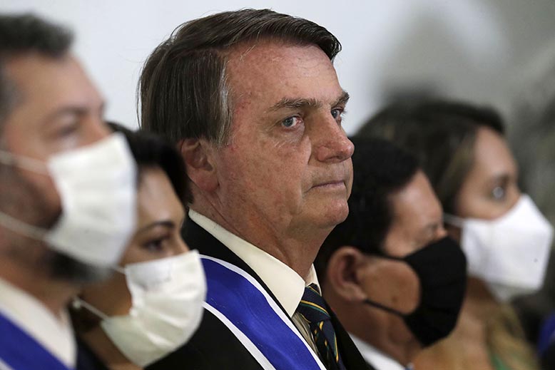 Brasiliens högerpopulistiske president Jair Bolsonaro (utan munskydd) har förringat både klimathotet och pandemin – och själv fått covid-19. Foto: Eraldo Peres/AP/TT.