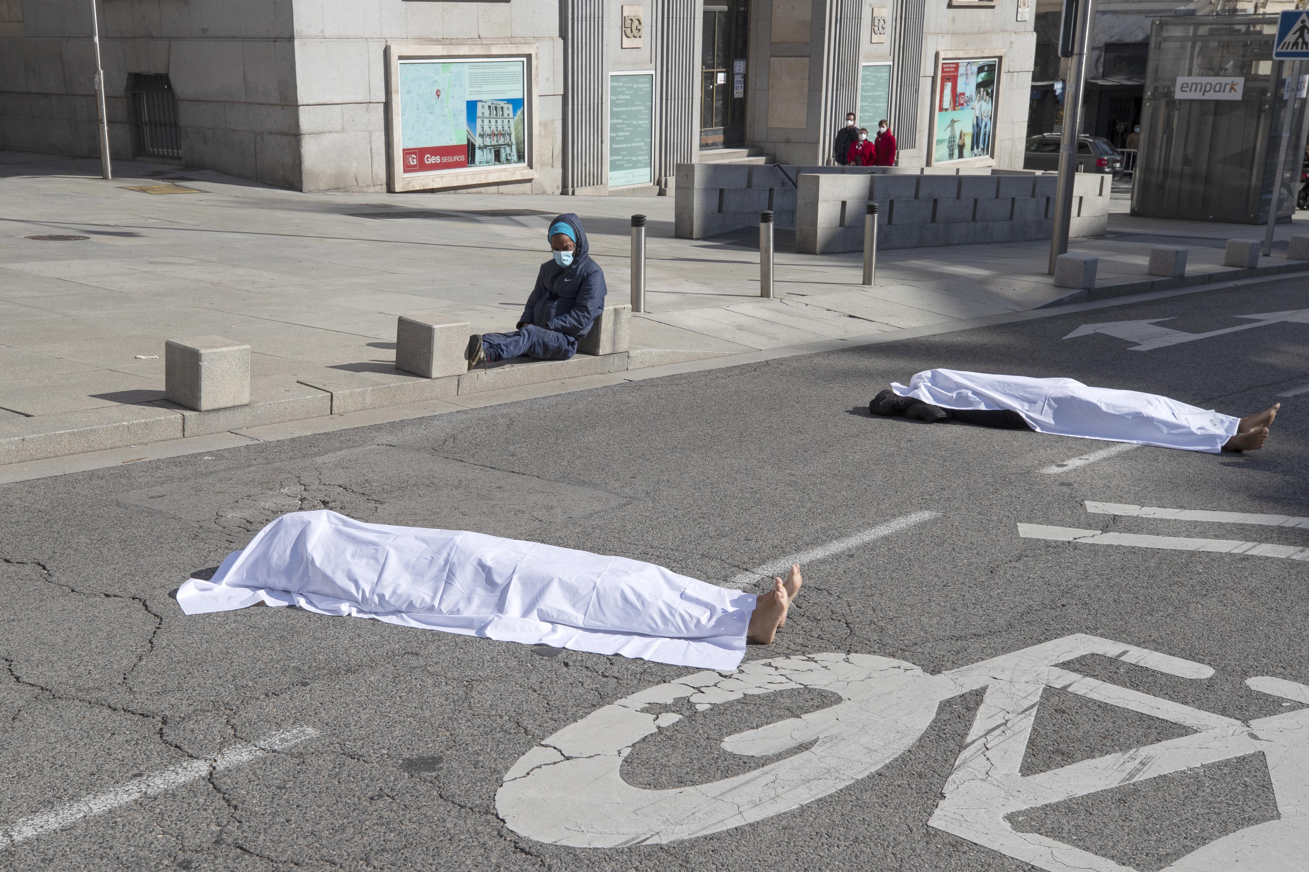 Klimatmanifestation i coronans tid. "Inaktivitet = död" var parollen när aktionen hölls utanför parlamentet i Madrid på Día de Muertos (de dödas dag) under allhelgonahelgen i år. Foto: Paul White/AP/TT.