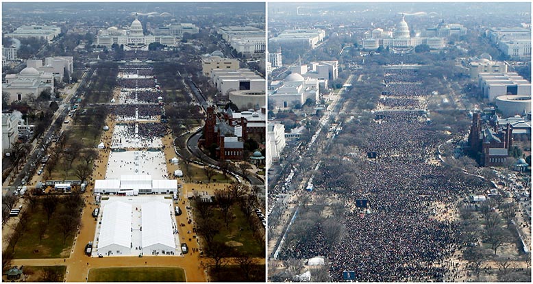 Donald Trumps första lögn som president: att hans installation 2017 (vänster) drog mer folk än någon annan. Till höger Barack Obamas 2009. Under sin tid i Vita huset rapporteras Trump ha ljugit eller vilselett cirka 20 000 gånger. Foton: Lucas Jackson och Stelios Varias/Reuters/TT.