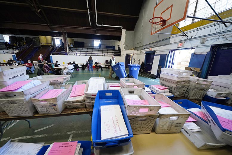 Rekordmånga poströster i coronatider, men inget fusk att tala om för det. Här ska röster gås igenom i Pennsylvania. Foto: Matt Slocum/AP/TT.