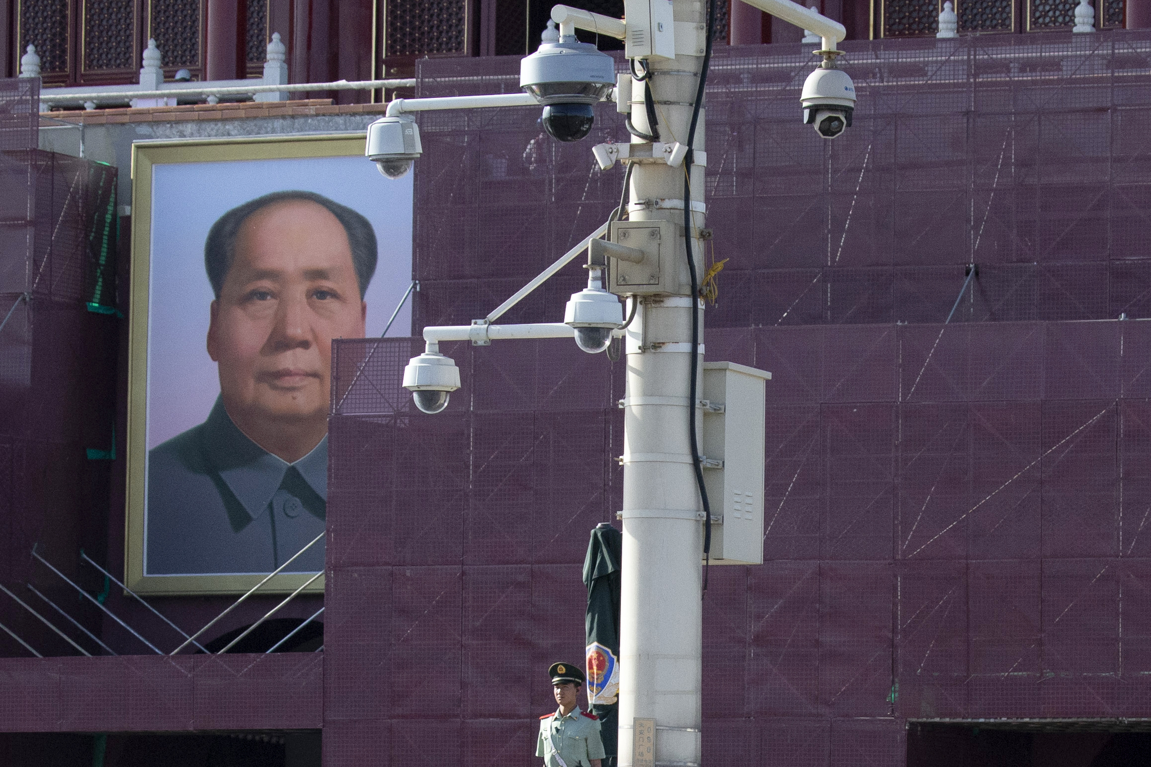 Övervakningskameror framför ett porträtt på exledaren Mao Zedong vid Himmelska fridens torg i Peking. Foto: Ng Han Guan/AP/TT