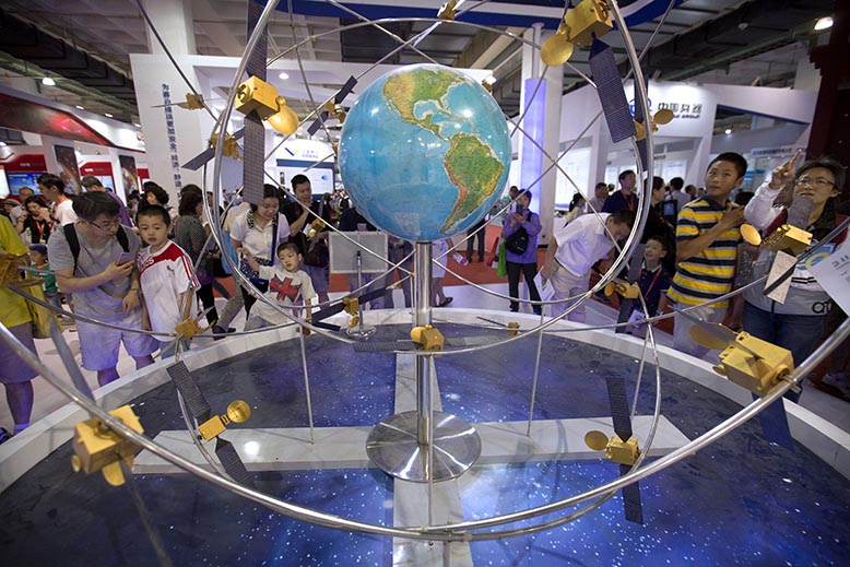 En modell av satellitnavigeringssystemet Beidou visas upp på den årliga teknikmässan i Peking. I år fick Beidou global täckning. Foto: Mark Schiefelbein/AP/TT