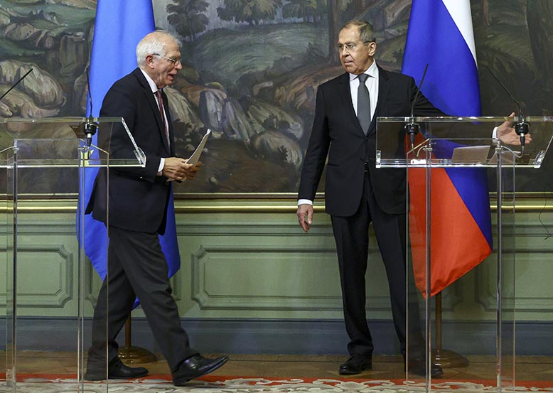 Relationerna mellan EU och Ryssland har nått botten. Här möts unionens utrikesrepresentant Josep Borrell och den ryske utrikesministern Sergej Lavrov den 5 februari 2021. Foto: Ryska UD/AP/TT