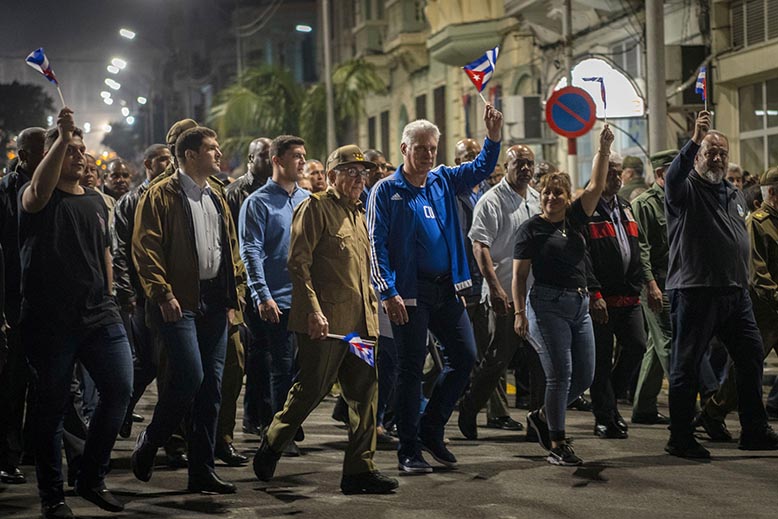 Generationsskifte. Raúl Castro (i keps t v i mitten) avgår. Yngre ledare som president Miguel Díaz-Canel (i blått) har en tung mantel att bära. Foto: Ramon Espinosa/AP/TT