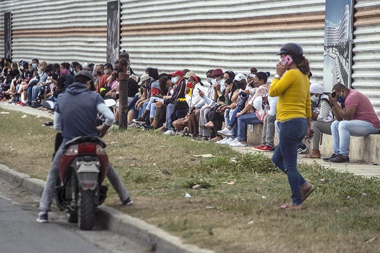 I väntan på att komma in i en statlig affär i Havanna. Köerna är längre och argare än vanligt. Pandemin gör köandet ännu långsammare. Foto: Ramon Espinosa/AP/TT
