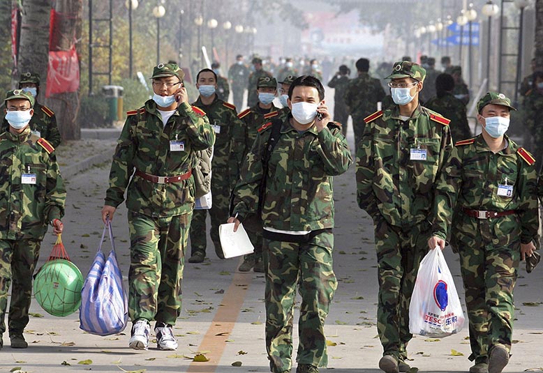 I Kina är militären närvarande även i den akademiska sfären. Alla studenter på universitetsnivå erbjuds militär utbildning. Bilden visar universitetsstudenter efter ett avslutat träningspass. Foto: AP/TT