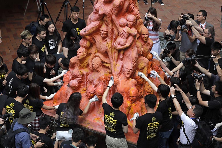 Studenter i Hongkong rengör statyn Skammens pelare som hedrar minnet av dem som dödades vid Himmelska fridens torg i Peking 1989. Sådana manifestationer ses inte med blida ögon av Kinas regering. Foto: Kin Cheung/AP/TT