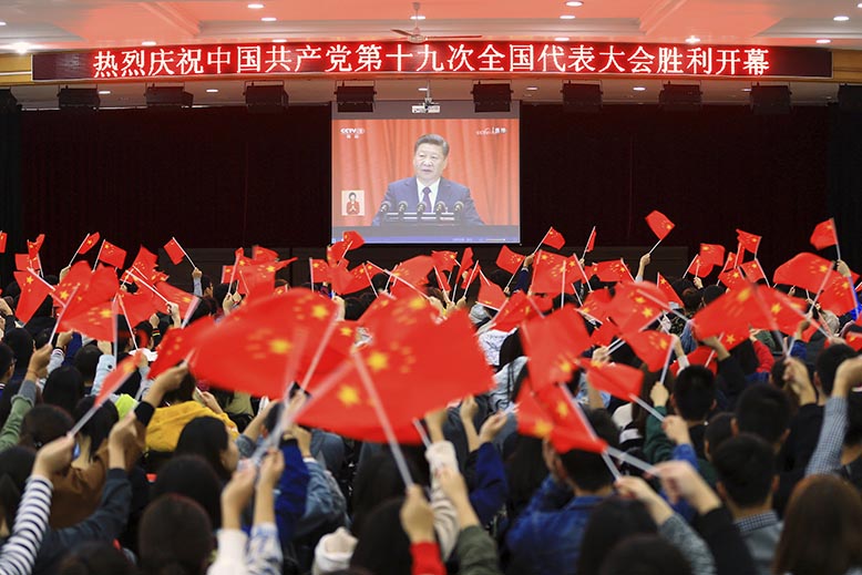 Under president Xi Jinping har det akademiska klimatet hårdnat. Lojalitet med Kommunistpartiet uppmuntras och kritiska lärare tystas. Här tar studenter del av Xis invigningstal vid den senaste partikongressen. Foto: AP/TT