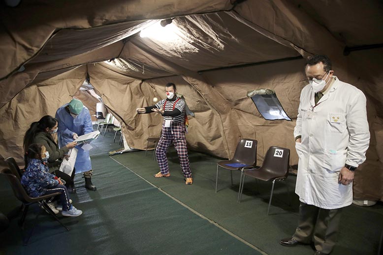 En clown uppträder för barn som vaccineras mot coronaviruset i Milano. Fler än 90 000 italienare har dött i sviterna av covid-19. Foto: Luca Bruno/AP/TT