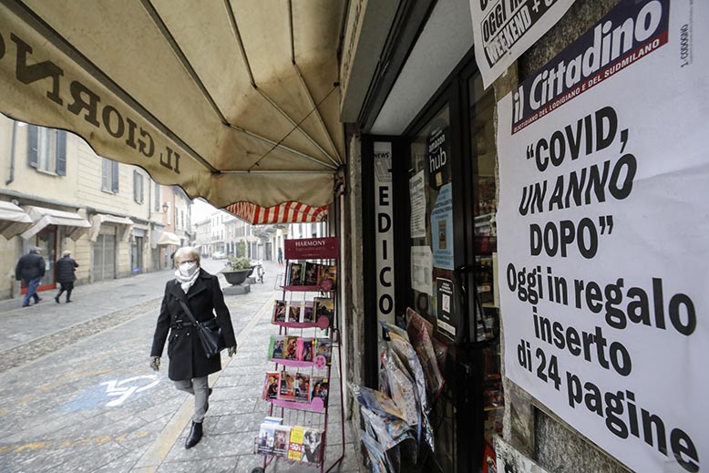 Löpsedeln lyder: “Covid, ett år senare”. Här i Codogno i norra Italien, upptäcktes det första fall av smitta inom Italien den 21 februari 2020. Dagen efter stängdes staden av med soldater som satte upp vägspärrar. Foto: Luca Bruno/AP/TT