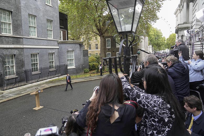 Mediebevakningen har varit intensiv utanför premiärministerbostaden under hösten. Den 25 oktober återvände Rishi Sunak från Buckingham Palace där han formellt utsetts till regeringschef av kung Charles. Foto: Kin Cheung/AP/TT