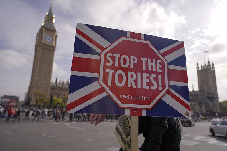 En demonstrant utanför parlamentsbyggnaden i London tycker att det är dags att sätta stopp för Konservativa partiets styre. Foto: Alberto Pezzeli/AP/TT