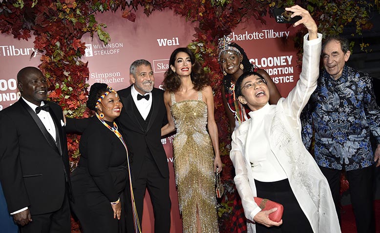 Journalistik och ansvarsfulla teknikföretag måste motverka lögnerna som bryter ner demokratin, anser Maria Ressa (i vitt), här med bland andra George och Amal Clooney, vars stiftelse tilldelade filippinskan sitt pris 2023. Foto: Evan Agostini/Invision/AP/TT