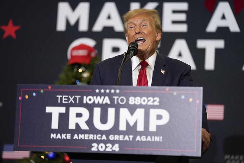Den 14 januari är Iowa först ut med att utse partiernas kandidater till presidentvalet i november. Här kampanjar Donald Trump i delstaten strax före jul. Foto: Charlie Neibergall/AP/TT