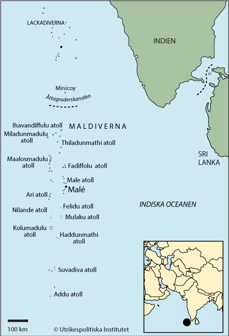 Maldiverna tillhör Sydasien och ligger motsvarande sju landmil från Indiens sydvästra kust. Här går en viktig farled för global handel, inte minst oljetransporter. Maldiverna ligger mellan Indiska oceanens flaskhalsar: Adenviken och Hormuzsundet på ömse sidor om Arabiska halvön i väster och Malackasundet mellan Malaysia och Indonesien i öster.