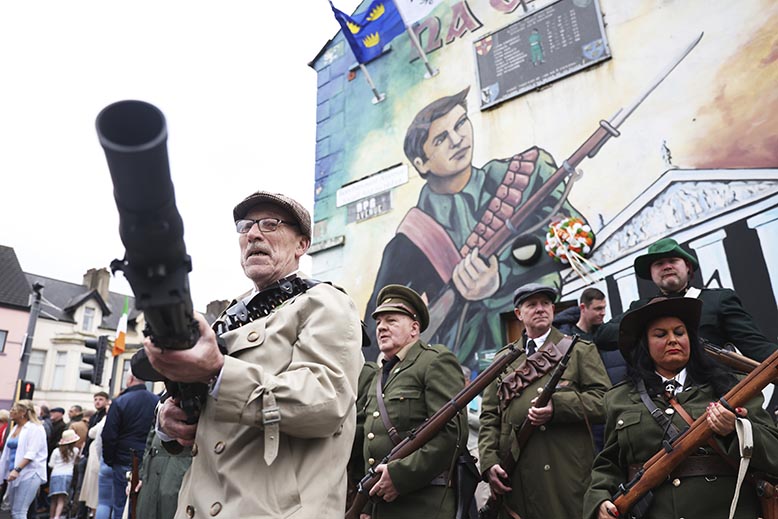 Belfastbor iförda gamla IRA-uniformer deltar i en parad 2023 organiserad av Sinn Féin för att markera årsdagen av påskupproret 1916 mot det brittiska styret. Foto: Peter Morrison/AP/TT