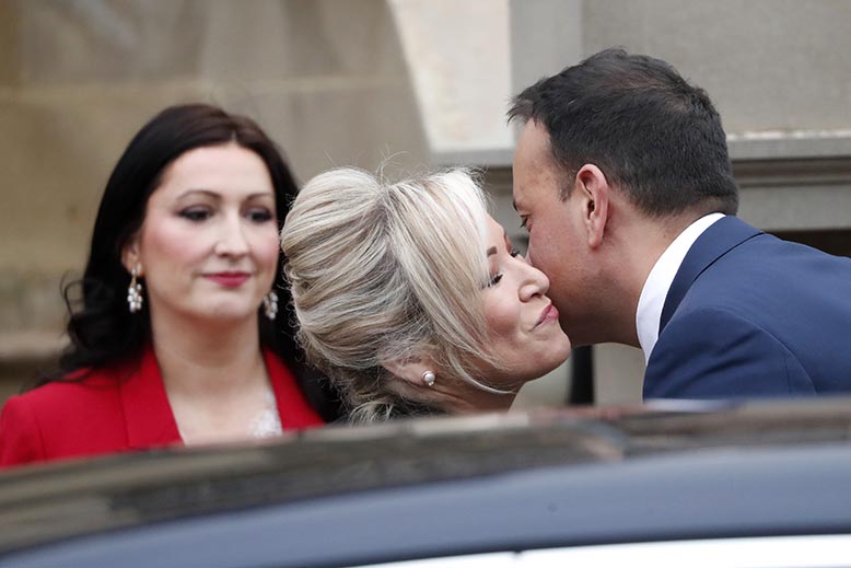 Sinn Féins Michelle O’Neill kindpussar ledaren i det land hon helst vill tillhöra själv, premiärminister Leo Varadkar från republiken Irland. I bakgrunden O’Neills regeringschefskollega Emma Little-Pengelly som vill vara britt. Foto: Peter Morrison/AP/TT