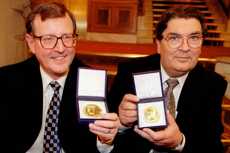 Unionisten David Trimble och nationalisten John Hume förärades 1998 Nobels fredspris för det så kallade långfredagsavtalet samma år. Foto: Foto: Knut Fjeldstad/FLT-PICA/TT