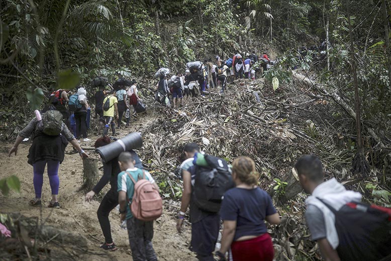 Migranter på väg genom Darién, det djungelbeklädda näset mellan Colombia och Panama som över en halv miljon människor passerade 2023. Foto: Ivan Valencia/AP/TT