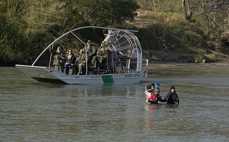 En gränspatrull ser på medan migranter tar sig över Rio Grande från Mexiko till USA. Foto: Eric Gay/AP/TT