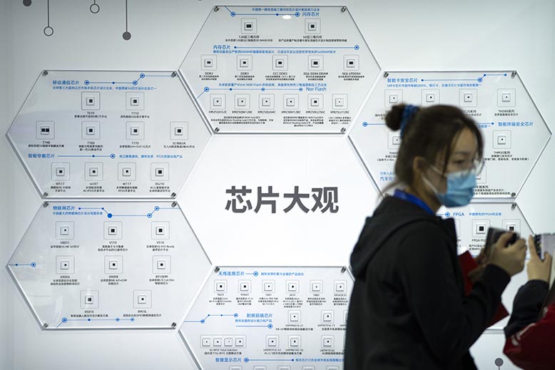 Kina är världens största marknad för halvledare och den egna tillverkningen ökar snabbt. Vid en utställning i Peking 2021 visades halvledare och datachip. Foto Mark Schiefelbein/AP/TT