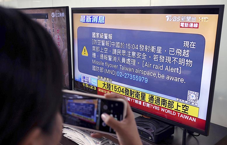 Spänt läge. Försvarsdepartementet i Taipei skickar en varning sedan Kina sänt en satellit över södra Taiwan, bara dagar före presidentvalet. Foto: Kyodo News via AP/TT
