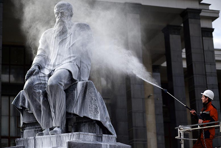 A municipal worker washes a statue of Fyodor Dostoyevsky in Moscow. The current leadership does not, however, dust off the famous Russian writer's strong feelings for Europe. Photo:Alexander Zemlianichenko/AP/TT