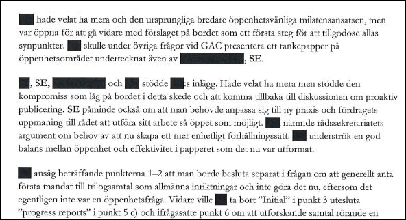 Det är inte bara ministerrådets kansli som för protokoll från mötena, det gör även de nationella representanterna. De svenska anteckningarna går att begäras ut från svenska regeringen, men där framgår bara Sveriges hållning. Alla andra EU-länders maskas (se bild nedan).
