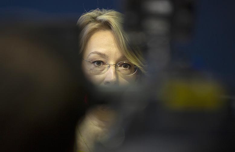Minister mot munkavle. Finlands EU-minister Tytti Tuppurainen möttes av kompakt tystnad av kollegorna när hon bad dem kommentera frågan om insyn i minister-rådet. Här ses hon på en pressträff den 13 oktober 2013. Foto: Virginia Mayo/AP/TT
