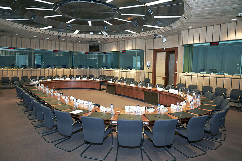 Det finns totalt 19 sådana här mötesrum i ministerrådets byggnader. Här förhandlar diplomater, tjänstemän, ambassadörer och ministrar från de 27 medlemsländerna. Foto: EU:s ministerråd.